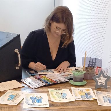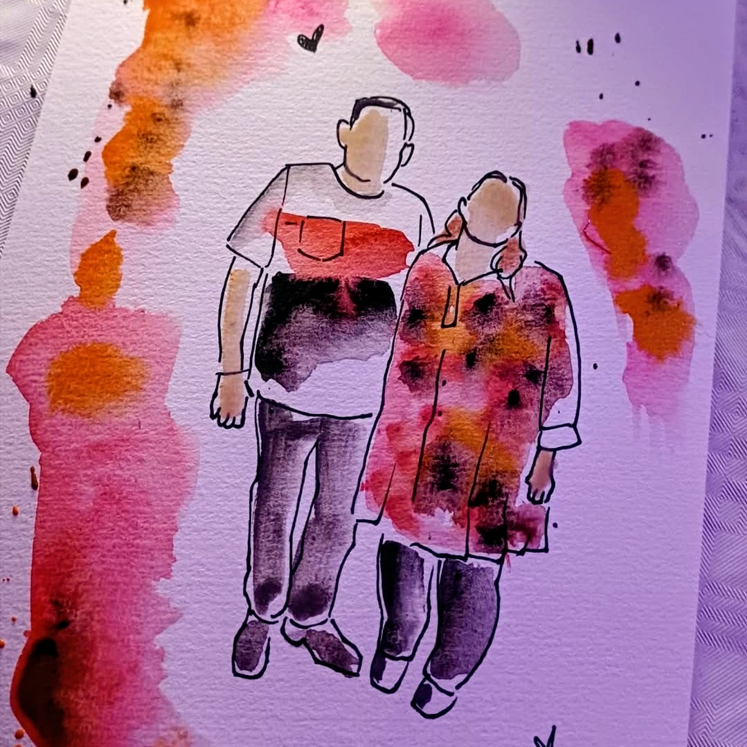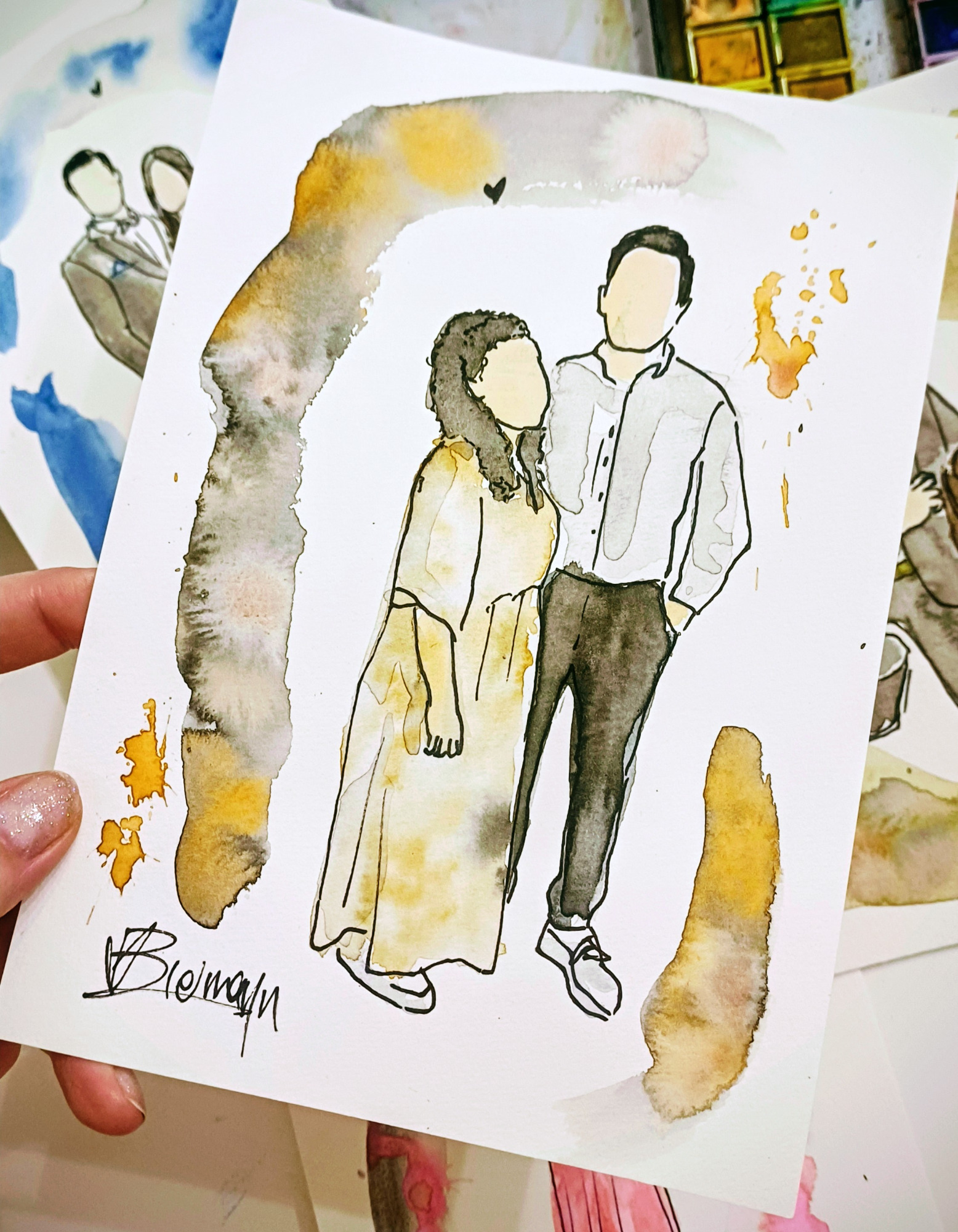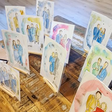 Eure Gäste können am Tag der Veranstaltung zu mir kommen, damit ich ein Foto von ihnen machen kann. Ich kreiere dann ein schönes Aquarell Portrait von ihnen im A5 Format. Die Gäste können, während ich sie male, das Event genießen und ihr Bild später abholen.